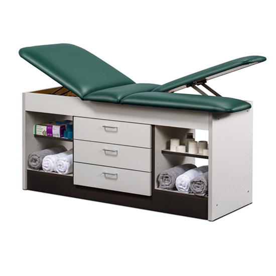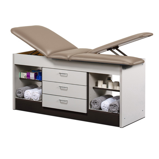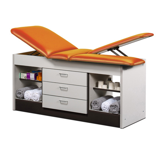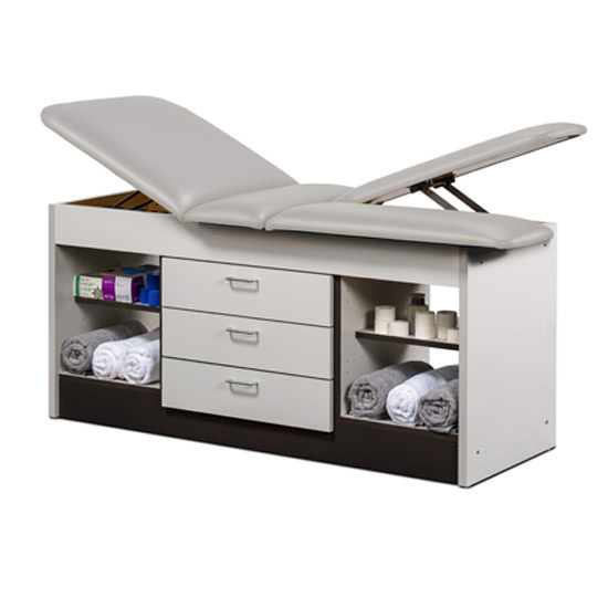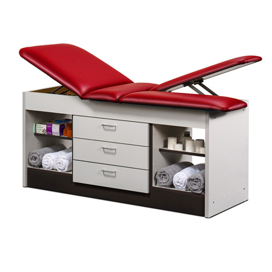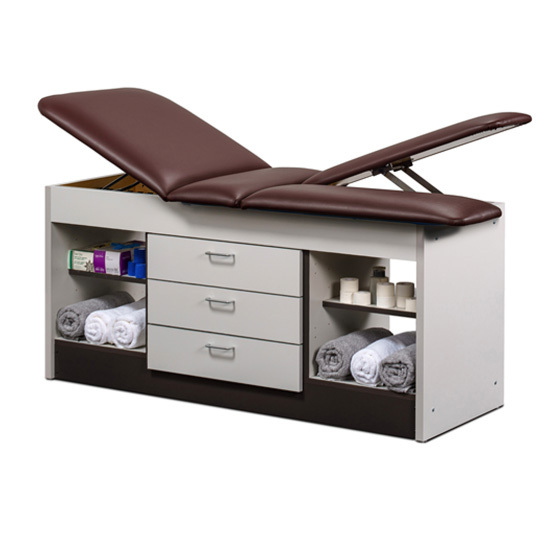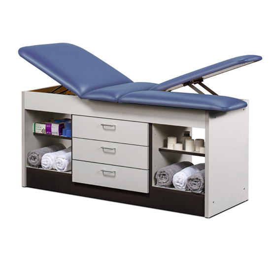 • All laminated construction • Adjustable backrest with 6 settings of approximately: 60º, 55º, 50º, 43º, 36º & 27º • Independent douple leg lifts with settings of approximately: 60º, 55º, 50º, 43º, 36º & 27º • Center drawer section has three drawers that hold up to 75 lbs. • Drawer section is easily reversible for access from either side • Drawers have smooth glides for easy open and close • Open storage on each side of center section • Seamless rounded corner top • 2” firm foam padding • Heavyweight, knit-backed upholstery • Ships assembled • 425 lbs. load capacity under normal use (193 kg)