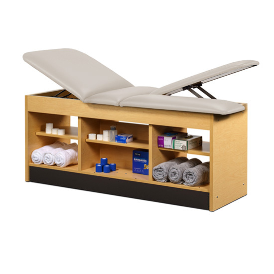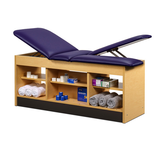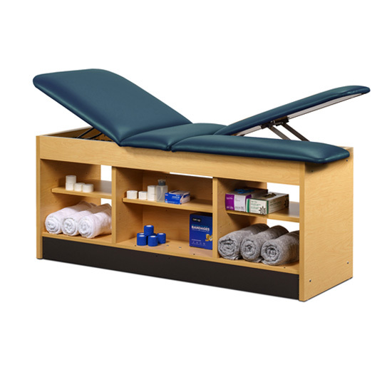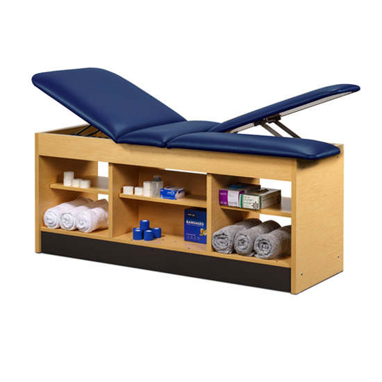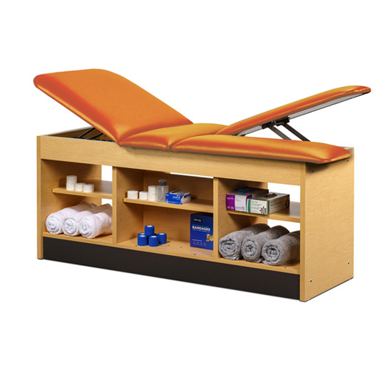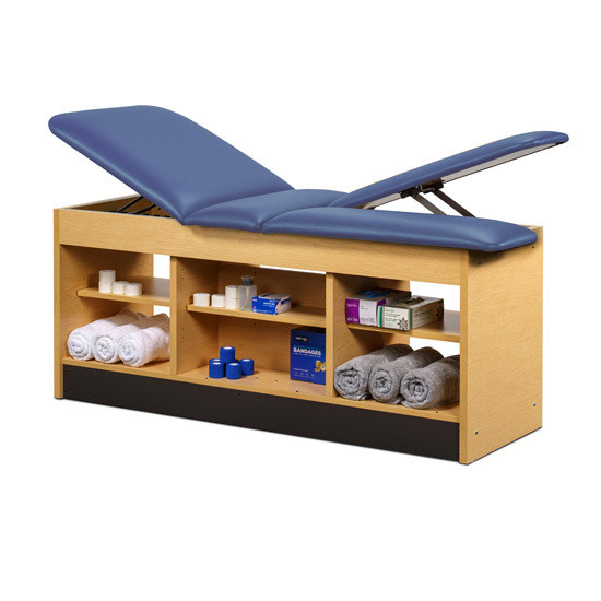 • All laminated construction • Adjustable backrest with 6 settings of approximately: 60º, 55º, 50º, 43º, 36º & 27º • Independent douple leg lifts with settings of approximately: 60º, 55º, 50º, 43º, 36º & 27º • Center section has an adjustable shelf on both sides with pass-through access • Open storage on each side of center section • Seamless rounded corner top • 2” firm foam padding • Heavyweight, knit-backed upholstery • Ships assembled • 425 lbs. load capacity under normal use (193 kg)